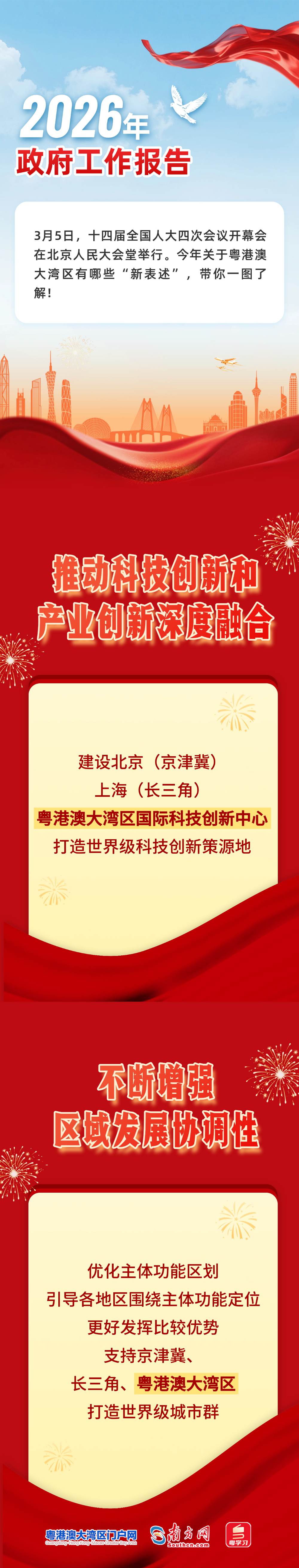 3月5日,十四届世界东谈主大四次会议开幕会在北京东谈主民大礼堂举行。在2026年的政府职责申报中,粤港澳大湾区两次被说起。这是自2017年以来,粤港澳大湾区衔尾第十年出目下政府职责申报中。这份“十年之约”,见证了大湾区从蓝图走向实景的坚实步调。让咱们通过图解,速览本年申报中的“粤港澳大湾区”。