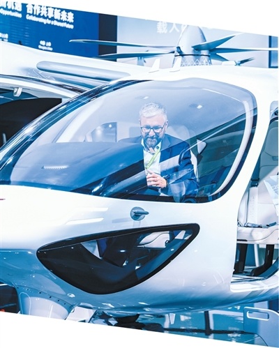 低空经济是第八届进博会最受关注的产业之一。图为第八届进博会汽车及智慧出行展区展出的中国首款倾转旋翼电动垂直起降飞行器吸引外国观众体验。王 初摄(影像中国)