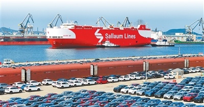 中国汽车在山东港口烟台港集结等待装船出口。唐 克摄(新华社发)