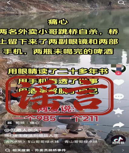 据“湖南省互联网举报中心”微信公众号音讯,近日,某短视频平台账号发布“莫名,两名外卖小哥跳桥自戕,桥上留住两副眼镜和两部手机,两瓶未喝完的啤酒,用眼镜读了二十多年的书,用手机识破了世事,用乙醇目田了我方。网友说:一个是985,米兰体育一个是211”的视频案牍并以河畔画面为视频布景。该视频飞快激发网民原宥热议。