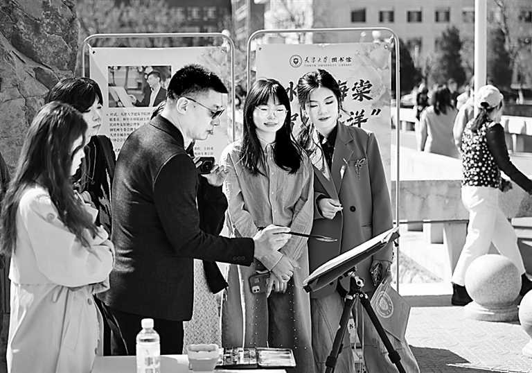 天津大学在“海棠季”通达实验室、科普基地等科研平台以及藏书楼、校史博物馆等文化场馆,邀请市民与师生共赏百年学府青春。图为天津大学丰足在校园内画图。新华社发