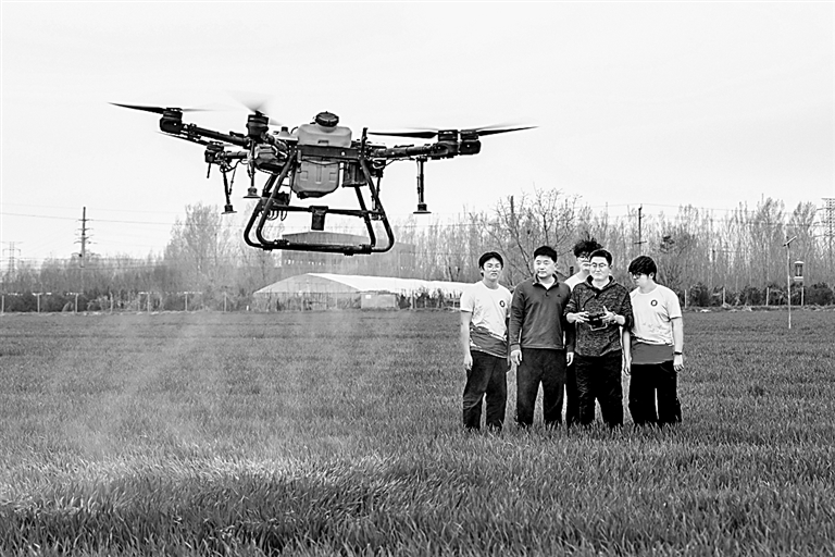 4月9日,山东轻管事事学院师生进行小麦飞防功课,推动专科手段与农业坐褥精确对接。翟慎安摄/光明图片