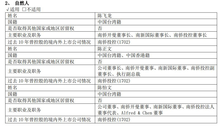据公开信息,陈飞龙为中国台湾企业家,南侨食物集团执行规模东说念主之一,祖籍福建泉州南安市,1937年10月生于上海,年少随家眷移居台湾,在台湾完成学业(淡江大学英文系)并永恒假寓、创业。陈飞龙是南侨工业独创东说念主陈其志的宗子,后接任南侨投控董事长,主导集团于1995年插足中国大陆商场,并推动南侨食物于2021年在上海证券交往所主板上市。彼时,南侨食物执行规模东说念主为陈飞龙、陈飞鹏、陈正文、陈怡文,其中陈飞龙、陈飞鹏为昆季联系,陈正文和陈怡文为陈飞龙之子女。