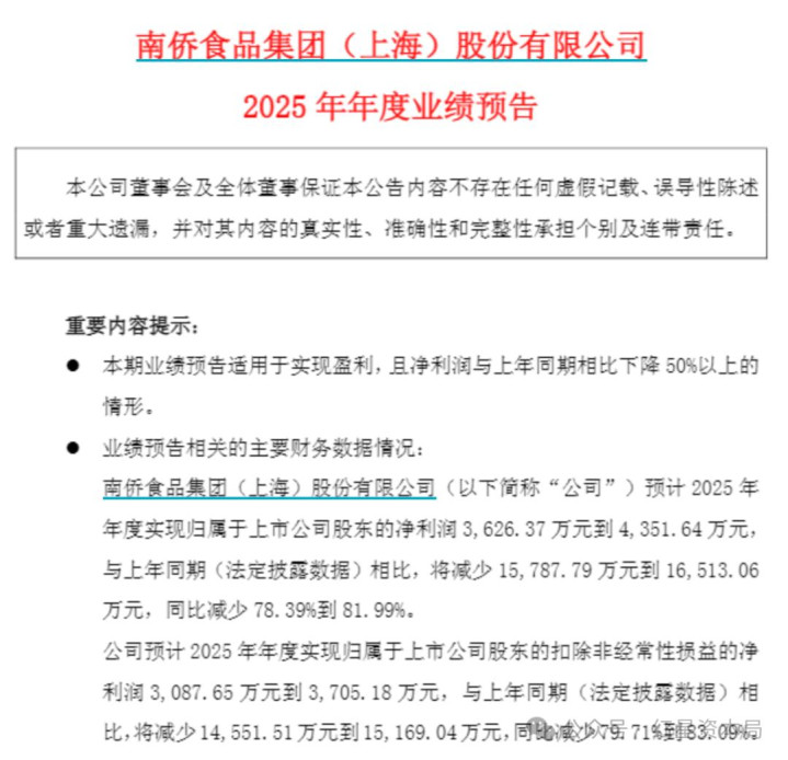 往常的一年里,南侨食物事迹承压。最新知道的事迹预报领会,南侨食物预测2025年年度竣事包摄于上市公司激动的净利润3626.37万元到4351.64万元,与上年同期比较,将减少1.58亿元到1.65亿元,同比减少78.39%到81.99%。