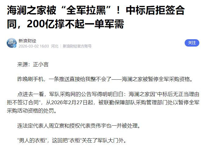 哈喽,民众好,小林哥这篇著述来分析2026年2月27日,队列采购网对外发布了崇拜的处罚告知,海澜之家因为采购行为里的违游记径,被径直暂停了参与三军物质工程服务采购的阅历,军采订单说弃就弃,海澜之家到底在怕什么?