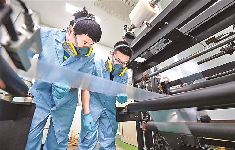 工东谈主在石墨烯薄膜分娩线进行功课。贵府图片
